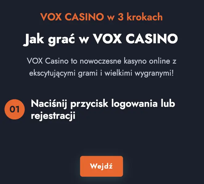 Zacznij już teraz! Zarejestruj się w Vox Casino, wybierz bonus powitalny i rozegraj pierwszą rundę. Czekamy na Ciebie w najlepszym kasynie online w Polsce!