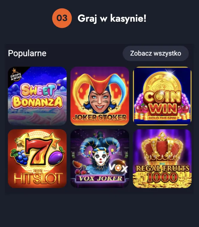 Nasza platforma stawia na prostotę — w menu głównym wydzieliliśmy kategorie takie jak „Jackpoty”, „Stoły”, „Gry pokazowe” oraz „Specjalne misje”. W każdej z nich czekają nie tylko emocjonujące gry, lecz także ekskluzywne bonusy i wyzwania, które sprawiają, że rozgrywka nigdy się nie nudzi.